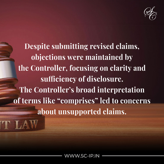 The Controller, in its response, submitted that the Appellants had couched the patent claims in very broad terms and used expressions such as “comprises”, which, as per the Patent Office, offered numerous possible permutations and combinations that may or may not show the intended results since they had not been amply disclosed as per Section 10(4) or 10(5) of the Act.