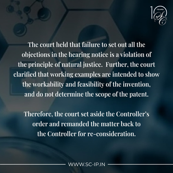 The Appellant argued that it was not provided a fair opportunity to address the objections as it was not mentioned in the hearing notice issued by the Controller. They also contended that the Controller has failed to differentiate between a composition and a method of treatment which is evident from the fact that the claims of the patent application are for a product (i.e. a composition) and not a method of treatment.